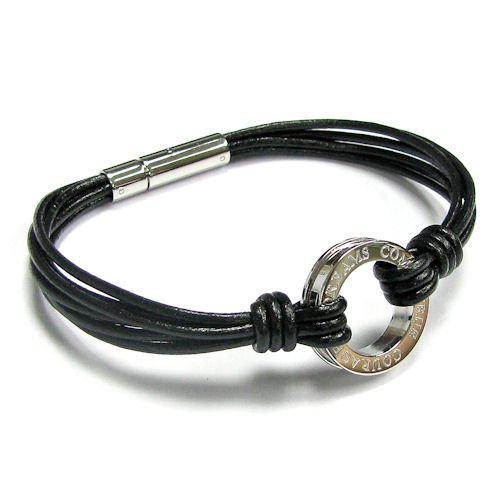Valentines Gift Stainless Steel (316L) Dreams Come True Black Leather Cord 2mm Circular Clasp Wristband Bracelets 8'' Men