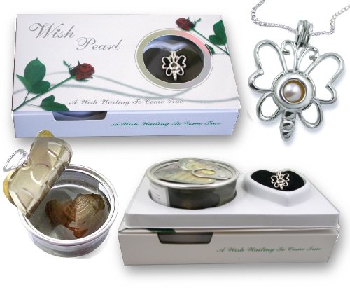 Only nature could create such a perfect gift, guaranteed to thrill whoever receives it The mystery and excitement that goes in the process of opening the oyster and finding your very own special pearl is unmatched. Each WISH PEARL GIFT SET includes : AN OYSTER CONTAINING A PEARL. 18K white Gold plated Butterfly PEARL CAGE . 18k White gold plated CHAIN 18" long Instruction Booklet Tool to open oyster The oyster is packaged in a container of special liquid solution -with no odor- . A major appeal of this unusual gift is the excitement and mystery as the recipient opens the oyster and finds their very own pearl. It takes three to five years for the oyster to form the pearl. The pearl will measure from 6.5-7.5mm. MAKE A WISH first before you open the can to get the pearl out. open the tin, who knows? your wish might come true.........
