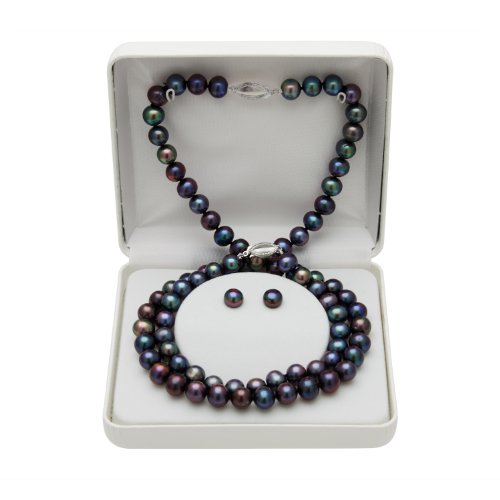 Black Freshwater Pearl and Sterling Silver Necklace, Bracelet and Earrings Set in Gift Box QSET-10438K-AM